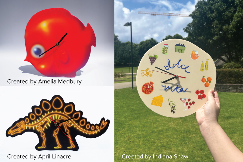 Students studying Commercial Illustration at the University of Newcastle, NSW are producing exciting work with their VersaOBJECT COi-300 Flatbed UV Printer. For a recent assignment, their task was to design and print products to sell at the well-known Olive Tree Market in Newcastle. To achieve this, students laser-cut clock faces from 6mm white acrylic and then UV printed their designs to bring them to life.