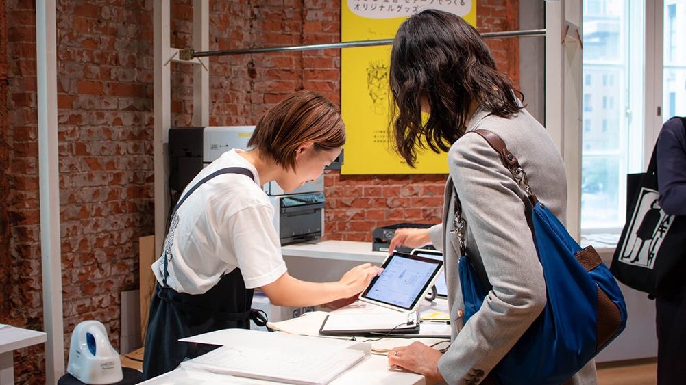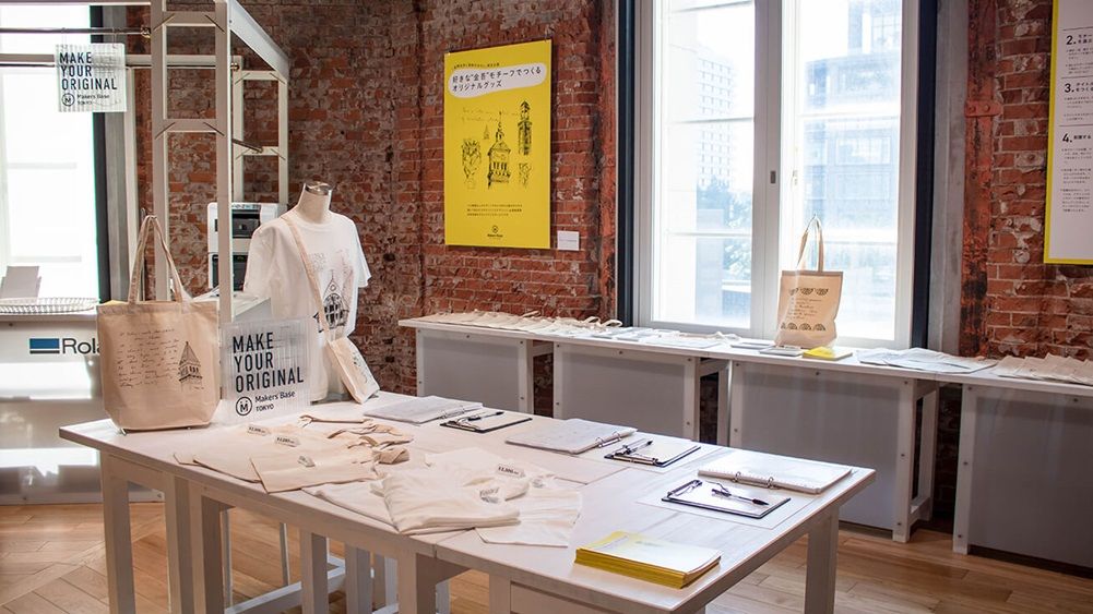A workshop planned with the same theme was set up in the last room of the exhibition where visitors could make their very own items featuring the work of Tatsuno Kingo. The membership-based, shared-factory Makers' Base that runs popular workshops in Tokyo organised the event, and Roland DG provided the BT-12 direct-to-garment printers that are capable of printing on cotton-based fabrics.