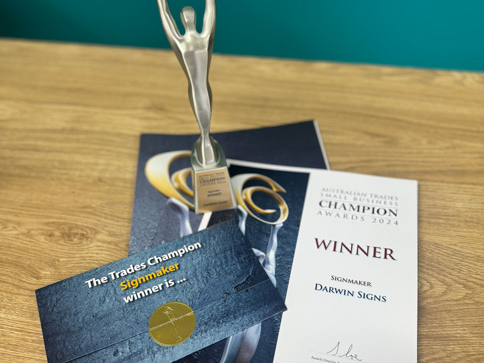 Darwin Signs are obviously doing impressive things. Their most recent achievement was Winning the 2024 Australian Trades Small Business Champions Award in the Signmaker category. This was their second nomination in 4 short years and to win this category among a large number of entrants from rural, regional and city centres across Australia speaks volumes for Darwin Signs. Various aspects of their operations were scrutinised including strategy, growth plans, financial performance, eco-friendliness, innovation, customer service quality and community support, and deemed to be ‘outstanding’; resulting in their win.