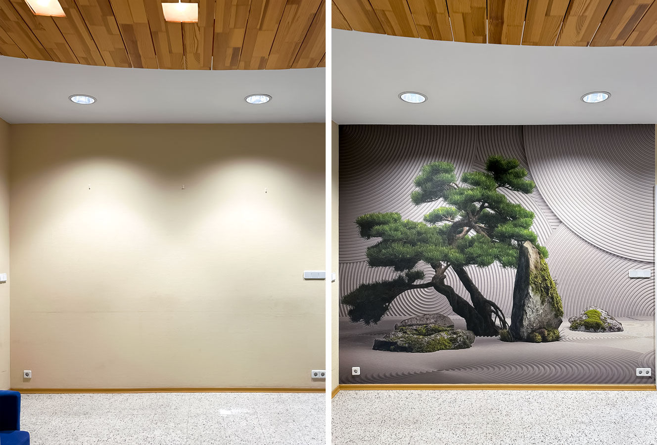 The Embassy of Japan in Lithuania wanted to upgrade a wall of the lecture room to introduce a Japanese tea ceremony and calligraphy to teenagers that would help them better experience a Japanese atmosphere.
