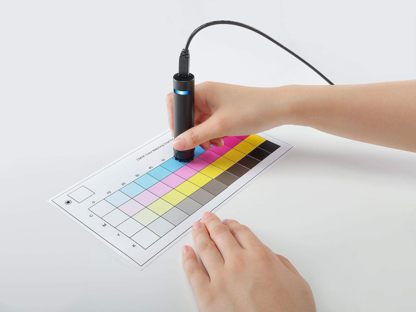 With a size similar to a penlight, that makes it easy to use and store just about anywhere, the VW-S1 is affordable and easy to operate. Simply tap the tip of the VW-S1 against the relevant colour in the colour chart specified by VersaWorks 6 and press the button. Measurements can be completed quickly, with a 4-colour chart taking approximately one and a half minutes, and a 6-colour chart taking around two minutes.